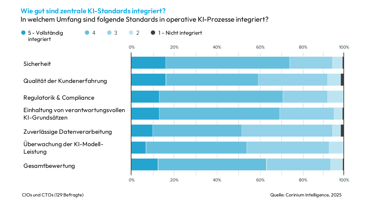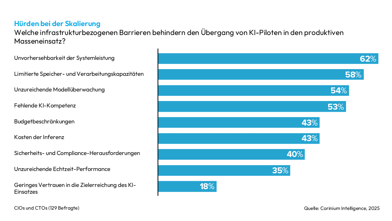 Hauptprobleme sind dabei weder Kosten noch Speicherplatz oder Rechenkapazität, sondern schlicht die Unsicherheit über die Softwarestabilität und die vorhersehbare Operationalisierung von KI. Über die Hälfte der Befragten kämpft mit begrenzten Ressourcen bei der Verarbeitung, und rund ein Drittel ist technisch nicht in der Lage, eine Überwachung in Echtzeit zu etablieren.Fast zwei Drittel der Chief Technology Officers (CTOs) nennen die Unvorhersehbarkeit der Systemleistung als größte Hürde für Wachstum.“