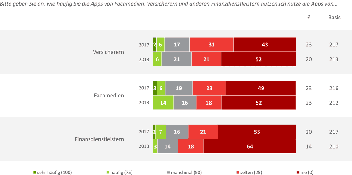 YouGov befragte 239 unabhängige Finanz- und Versicherungsmakler zu ihrer beruflichen Mediennutzung im vorigen September. Klar war: Mit der zunehmenden Nutzung von Smartphone und Co. geht auch eine vermehrte Nutzung von Apps einher. Aber mehr als die Hälfte der Versicherungs-Makler nutzt grundsätzlich Apps von Versicherern (57 Prozent) oder Fachmedien (51 Prozent). Apps von Finanzdienstleistern werden im Vergleich von lediglich 45 Prozent der Befragten genutzt. Vor vier Jahren lagen die Nutzeranteile bei 48 Prozent (Versicherer- und Fachmedien-Apps) sowie 36 Prozent (Finanzdienstleister-Apps).