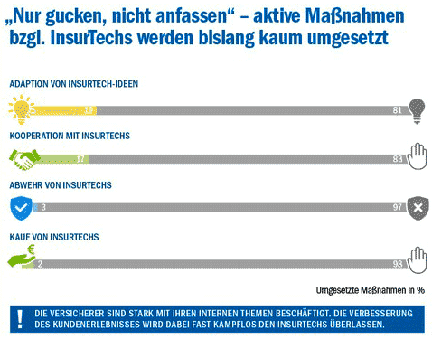 Die Unternehmen haben bislang kaum Maßnahmen umgesetzt, um diese Chancen zu realisieren oder den Risiken zu begegnen. Nur 19 % der Studienteilnehmer geben an, InsurTech-Ideen adaptiert zu haben. 17 % der Befragten bejahen, mit InsurTechs zu kooperieren, und 3 % haben Abwehrmaßnahmen umgesetzt.