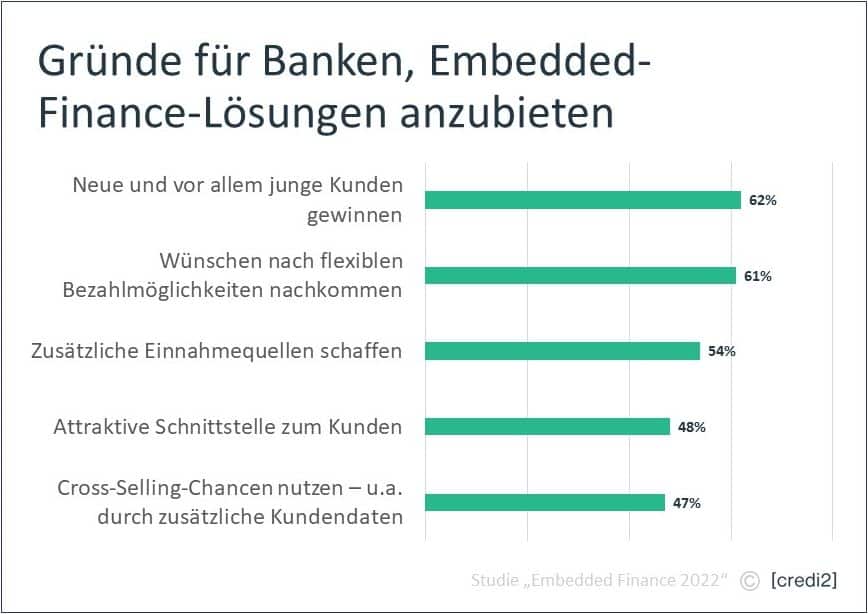 Dennoch wissen die Banken: Sie müssen den Wünschen der Verbraucher nach flexiblen Bezahlmethoden nachkommen. 62 Prozent wollen mit Embedded-Finance-Angeboten neue und vor allem auch junge Kunden der Generation Y und Z gewinnen. 54 Prozent wollen damit zusätzliche Einnahmequellen schaffen und 47 Prozent sehen attraktive Cross-Selling-Potenziale.